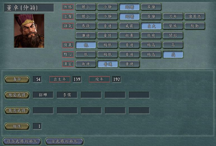 这7位仇家中有4位是割据一方的君主(公孙瓒、曹操、袁绍、孙坚),按照游戏设定,一旦董卓在野战中被这四个势力捕获,不会有劝降的机会,直接就会被下令处斩。更惨的是,董卓在游戏里没有任何血缘亲人,唯一的死党李儒能力有限,根本无法为他提供太多庇护。这样的人际关系,让董卓成了游戏里处境最危险的武将,走到哪都是“人人得而诛之”。