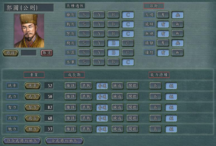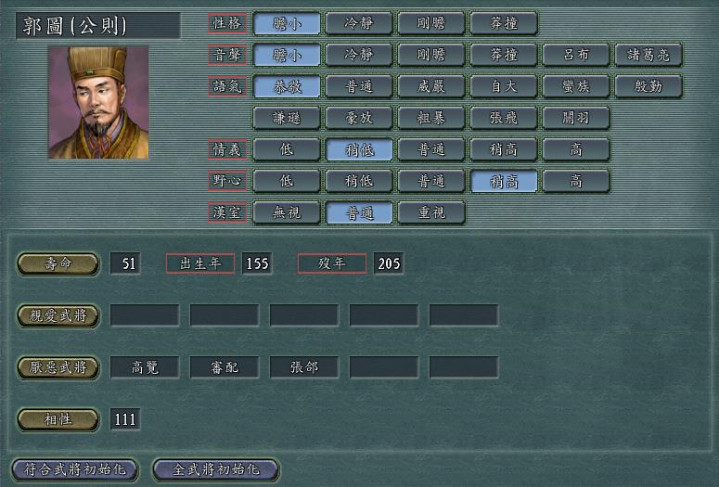 作为袁绍麾下的谋臣,郭图在游戏里的设定是全面拉胯的。五维属性中也就智力勉强能看,勉强够得上二流谋臣的水准,其余的统帅、武力、政治、魅力全是拖后腿的,说是“战五渣”也不为过。但比起糟糕的能力,他的人际关系才更让人头疼,不仅没有一个亲爱武将,还跟三位同僚结下了死仇,妥妥的团队破坏者。