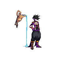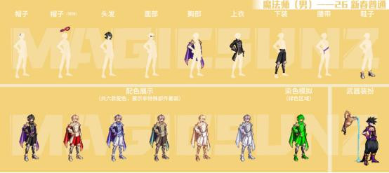 时装整体表现上,为蕴含了一定骑士风格的术士礼服设计,意向上更偏向宫廷魔术师的概念表达,也是与大阿卡那“魔术师”意向的契合,从选题到点阵表现上都很贴合男法师职业特质,表达其关于魔术的纯粹意志力,表现职业特征和英气属性。