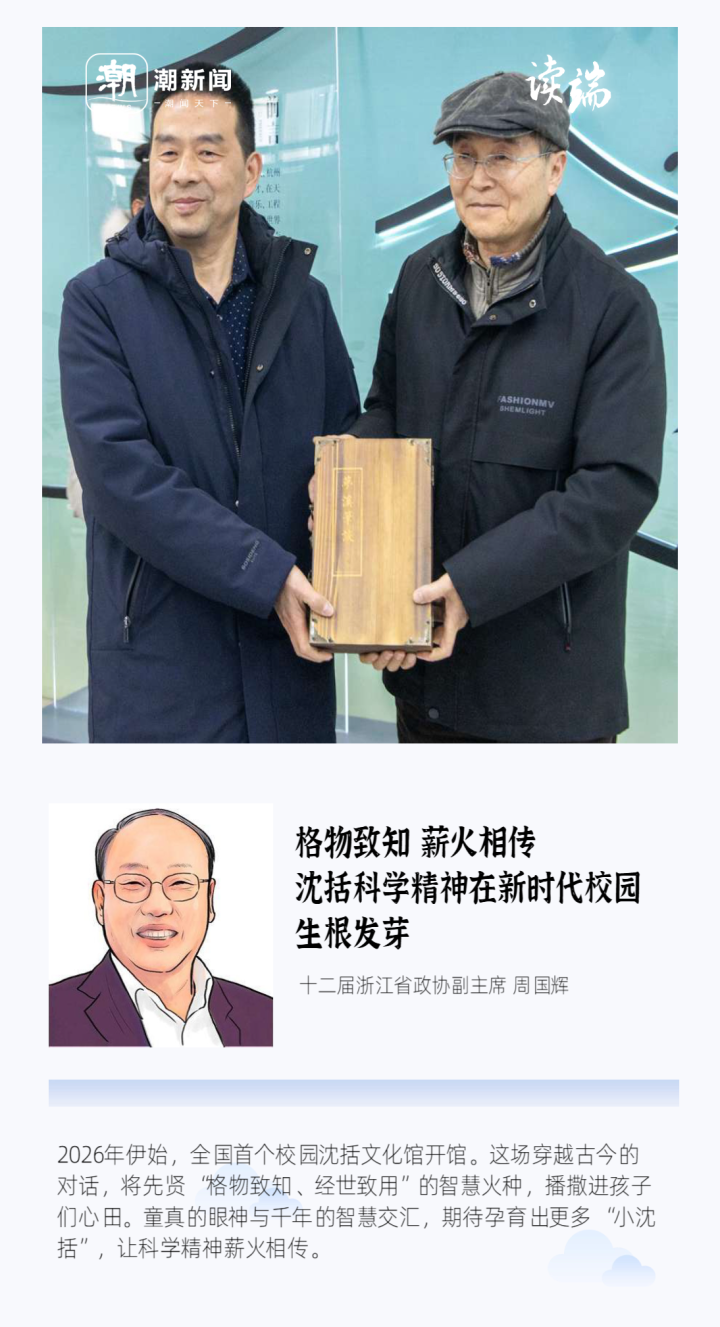 2026年伊始,纪录片《沈括》主创人员走进杭州余杭区沈括小学同孩子交流,拉开了余杭区“沈括科学精神进校园”系列活动的序幕,同时,可能是全国唯一的校园沈括文化馆也正式开馆。作为《沈括》纪录片的联合出品人,这一年多来,我感受了沈括的科学精神博大精深,感受了文艺工作者的倾情塑造和演绎,也感受了沈括故里的党政组织和干部对杰出人才和文化遗产的珍视厚爱,这次又被现场热情交流气氛特别是孩子们童真的发问和眼神所感染。