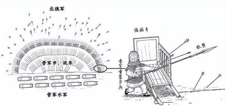 不过很快长孙晟的三万援兵赶到了,如此十倍优势的兵力全方位冲击,晋军大弩发射不及,根本无法遏制他们。好在有车阵与盾牌阻挡,北魏骑兵冲上来也只能下马与晋军短兵肉博。想当年刘裕北伐南燕时,也曾用过这样的车阵,但当时战场广阔,燕军骑兵还能绕后,而这次晋军车阵是升级版的背水却月阵,北魏骑兵无法迂回包抄,反而晋军可以在作战不利时通过水面增援。另外松软的河滩也大大降低了北魏骑兵的冲击速度。如此一来,魏军的兵力与兵种优势都无法发挥,只能拥挤在阵前与晋军隔着车子互砍,或者想以搭人梯的方式爬过彭排,场面一片混乱。