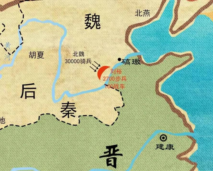 义熙十二年(416年)八月十二日,东晋权臣、北府名将刘裕发动北伐,他亲统大军兵发建康至彭城,坐镇指挥五路前锋部队,从各个方向,同时对后秦发起攻击!结果只花了两个月,五路北伐先锋军中的檀道济部便扫平中原,克复了故都洛阳。各路前锋军立功心切,遂不等刘裕主力大军,自作主张挺进潼关,与后秦军队陷入了长久的相持战。