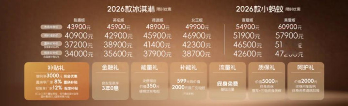 2026款奇瑞冰淇淋精准切入不同消费群体的个性化需求。甜趣版以3.4万元的起售价打造入门级精品,提供椰子白、浅藕粉等多巴胺配色;英伦版售价3.56万元起,主打复古格调;竞速版定价3.79万元起,面向追求运动风格的年轻用户;顶配的女王版售价3.87万元起,专为都市时尚女性打造。与此同时,全新小蚂蚁也同步推出271km喜爱版与真爱版两款车型,续航由251km提升至271km,进一步丰富产品矩阵。