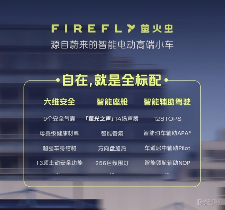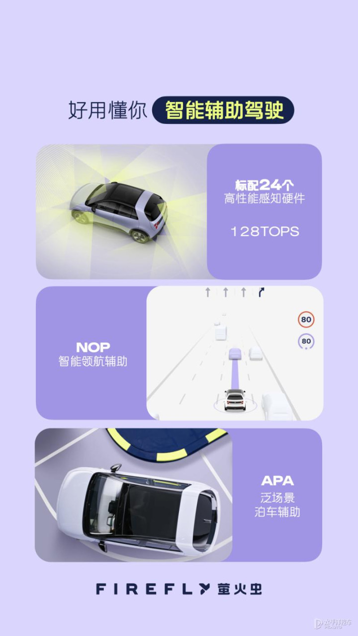 萤火虫的NOP智能领航辅助在全国高速路、城市快速路和高架都好用、APA泛场景泊车辅助可见即可泊(立体车库、窄路泊车、低矮车位)。