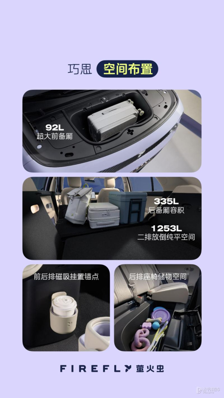 92升前备箱容量同级最大,二排座椅翻折后与后备箱形成超1250升纯平空间。车内27处储物空间,还有多处隐藏收纳设计,满足多样收纳需求。