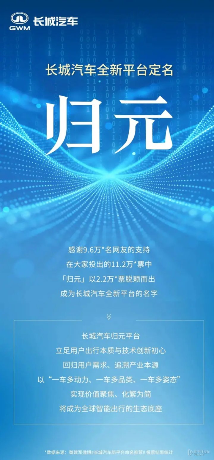 此前长城汽车董事长魏建军发起投票,平台命名推荐“归元”外,还有万里、辰星、太初、山海、悟空、烽火、九鼎、铁锅、驴火等。同时,开云魏建军表示归元平台将采用一车多动力,从而满足不同消费群体的购车需求。