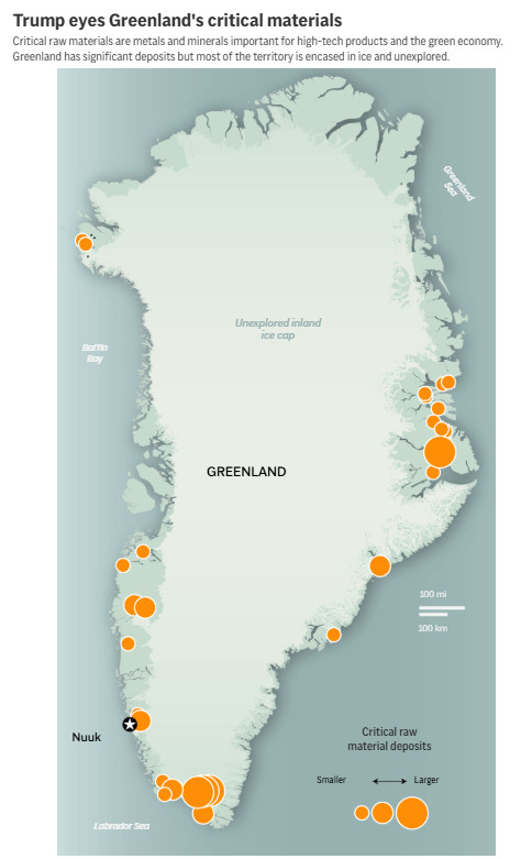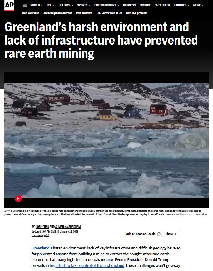 文章说,格陵兰岛蕴藏着大量矿床,但其大部分领土被冰雪覆盖且尚未勘探开发。格陵兰岛可能多年内、甚至永远都无法实现稀土生产。尽管一些企业仍在尝试开采,但对蕴藏在格陵兰岛岩石中150万吨稀土的开采尝试大多仍停留在勘探阶段。业内人士认为:“(美国政府)对格陵兰岛的执着,与其说是为科技行业寻求现实的供应解决方案,不如说是地缘政治姿态的展现。围绕这些关键矿物的炒作远远超出了其背后的科学依据和经济可行性。”