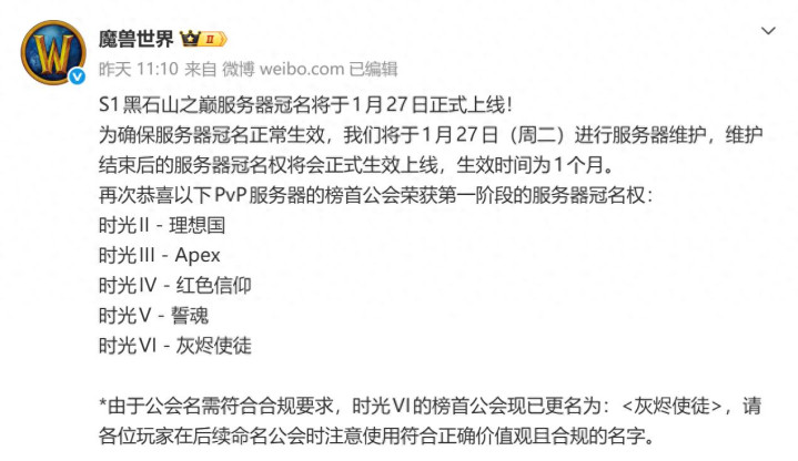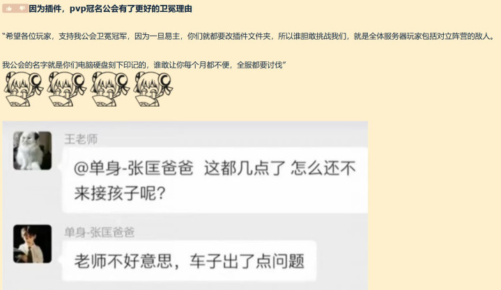 只能说魔兽世界时光服的玩家们脑洞是真的大。有玩家发帖说,这样冠名的公会有更好的卫冕理由了,甚至直接编了内容说:“希望各位玩家,支持我公会卫冕冠军,因为一旦易主,你们就都要改插件文件夹,所以谁胆敢挑战我们,就是全体服务器玩家包括对立阵营的敌人。”不过玩归玩闹归闹,估计也没有太多公会愿意参与竞争了吧。