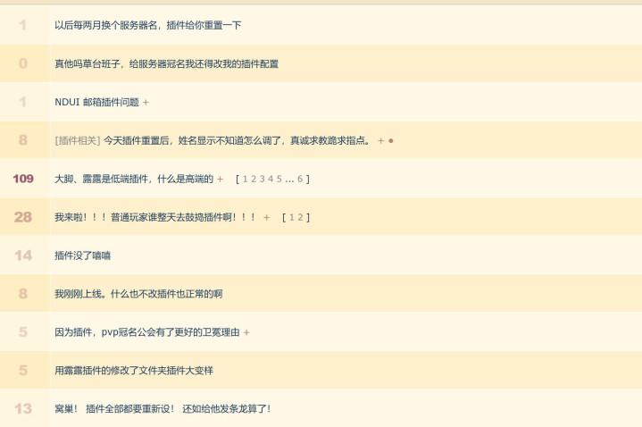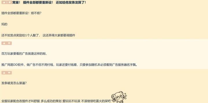 冠名这件事情,其实除了被冠名的公会可能开心一点,其他玩家都不开心了。当然,核心原因就是插件重置了。甚至有玩家表示:难道两个月换个服务器名,就要重置一次插件?等于说普通玩家们成为了各大公会play的一环。所以目前的结果就是时光服的玩家们需要每两个月重置一次插件,除非插件作者或者是雷火来解决这件事情。