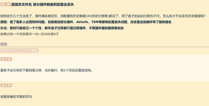 先夸一下雷火吧。其实在服务器更新之前,不少玩家们就已经预料到了可能会导致插件失效。毕竟服务器名字一旦变掉,那么所有的插件都无法匹配上,包括位置设置以及宏。所以雷火良心的一点在于选择周二而不是选择周四,因为选择周四的话,估计会让玩家们手忙脚乱,毕竟这个时候团本也更新了,所以给几天时间让大家熟悉也算是良心了。