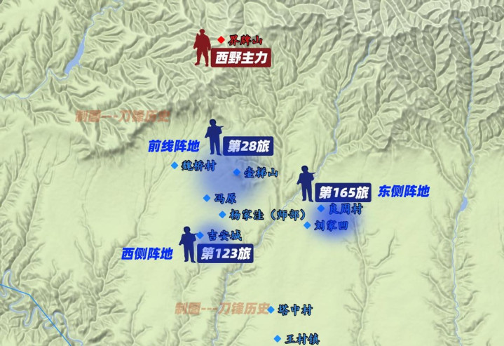 整编第三十六师在冯原一线的部署,其实已经透露出一种“不敢北进”的心态。钟松接到胡宗南的命令,认为西野主力主要集中在合阳北部山区,于是选择在冯原一带“就地防守、准备救援”。整编第二十八旅负责壶梯山至冯原以北阵地;整编第一六五旅一部掩护右翼安全,主力驻冯原镇东南;整编第一二三旅及师直属队为预备队,集结在冯原镇附近。